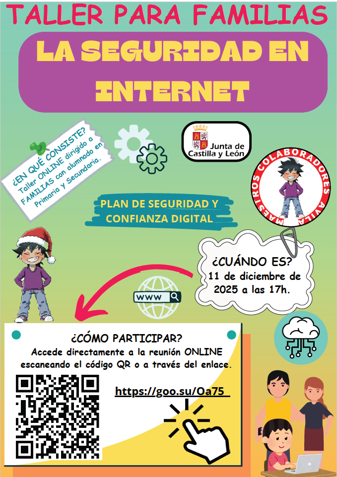 Videoconferencia “LA SEGURIDAD EN INTERNET” dirigida a Familias con alumnado en Primaria y Secundaria, que se celebrará online el 11 de diciembre a las 17 horas (en infografía que se adjunta se incluye QR y/o enlace para acceso a la reunión) y en donde trataremos aspectos relacionados con el uso seguro y responsable en Internet y también daremos a conocer el Aula Moodle PSCD a disposición de los centros para abordar esta temática en las aulas.