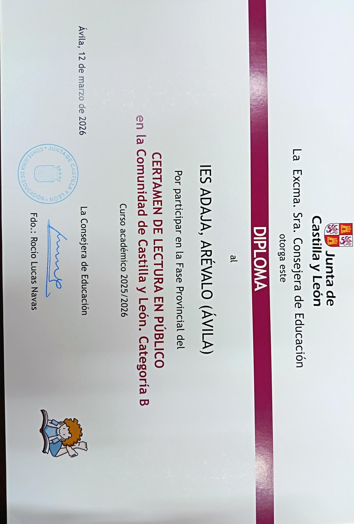 DIPLOMA PARTICIPACIÓN EN FASE PROVINCIAL CERTAMEN LECTURA EN PÚBLICO. CURSO 2022-23
